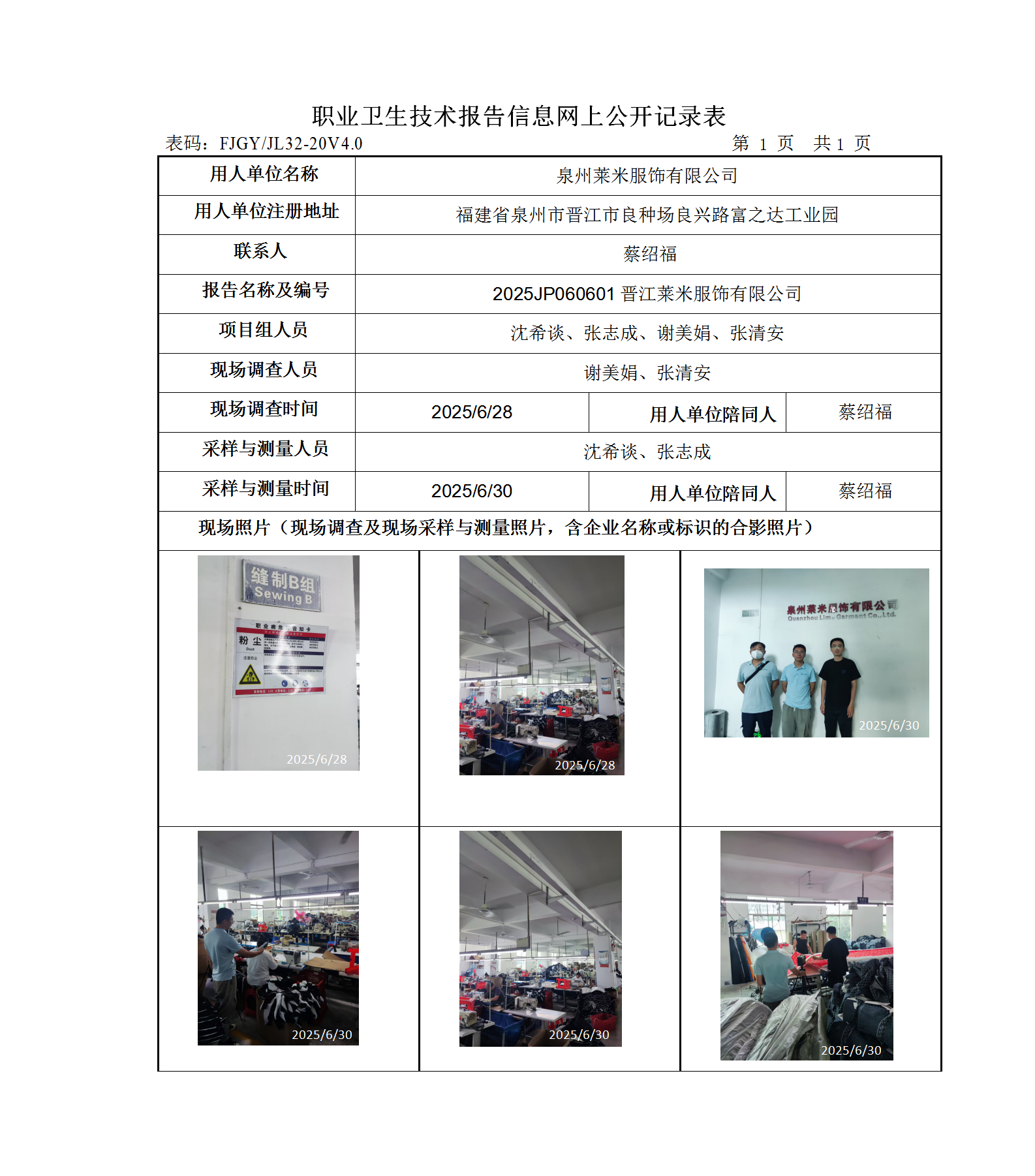 晉江萊米服飾有限公司-2025年工作場所職業(yè)病危害因素檢測(cè)